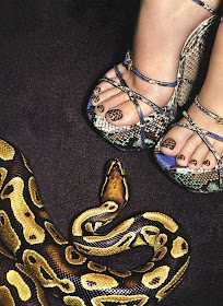 There's a new fad going around that involves of all things... 'SNAKES'!  The reptile has been around for ev'.  It's been on your bags and on your shoes and now it's making it's way to your toes!  Snakeskin pedicures are the new fad and women are forking out the $300 bucks it costs to have 'real' & "yes you heard me right...snakeskin sheds adhered to their toenails!"  A California manicurist, Terri Silacci of Monterey California's Euphoria Lounge Salon & Spa, came up with the idea when one of her children brought home a piece of snakeskin from science class.  She said it took her about six months to perfect the whole process which involves using 'Bio Sculpture Gel' instead of regular nail polish & a custom cut piece of snakeskin scaled to the size of each toe.
